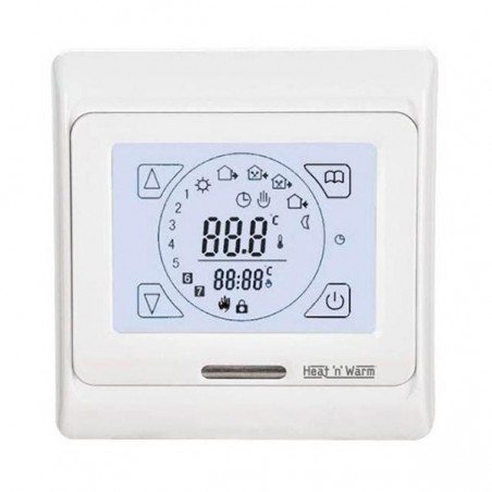 Программируемый регулятор с датчиком температуры пола и воздуха, белая подсветка, автономная работа встроенных часов, сенсорный экран.
